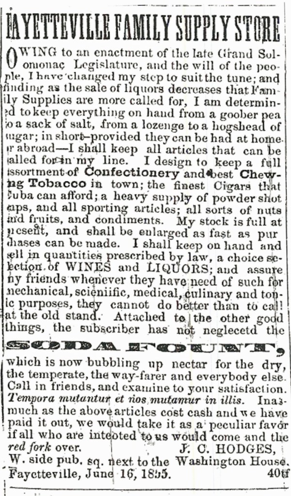Reflecting the increasing regulation and growing public hysteria about alcohol use under the incitement of temperance activists, the issuance of licenses in Washington County dropped off dramatically by the mid-1850s. In 1855, the Arkansas legislature passed a law allowing local townships to vote whether to allow alcohol sales within their boundaries. Fayetteville’s newspaper the South-West Independent carried frequent comment on this state of affairs, the tenor of which insinuates the editor’s low regard for such efforts, such as this February 10, 1855, piece: