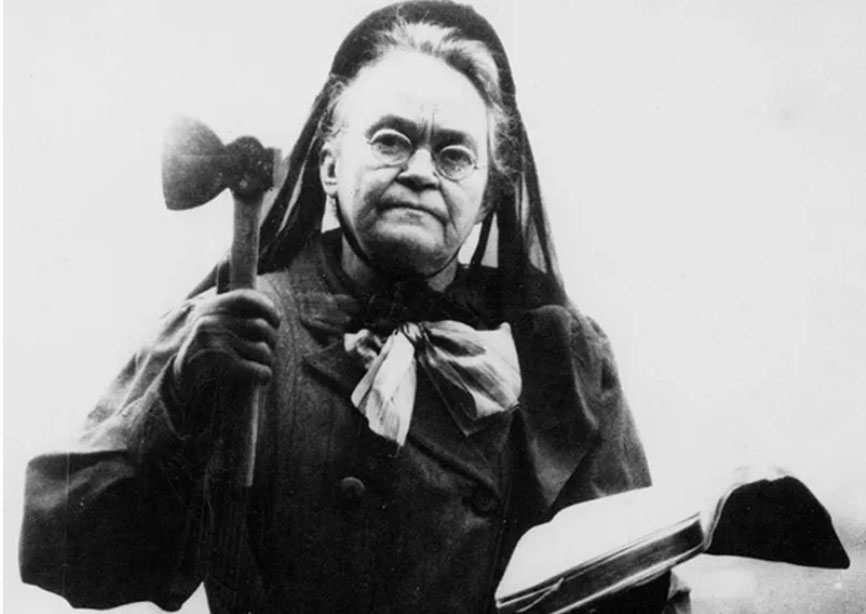 Carrie Nation became famous for her attacks on alcohol-serving establishments, using rocks, bricks, and her signature hatchet to destroy liquor bottles, mirrors, and bar fixtures. Before resorting to violence, she would kneel outside saloons, sing hymns, and deliver strong sermons to patrons and owners, sometimes calling herself the “Destroyer of Men’s Souls”.