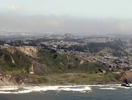 Sated by our delicious meal, we said our goodbyes to Warren and his family. Our search for story settings then led south along the coast following the “Great Highway.” Densely populated streets disappeared behind us as the road merged with Highway 35. Soon our path became Skyline Boulevard as we neared Daly City. Our objective? The great and powerful magic spot at Mussel Beach, where the San Andreas Fault leaves land and enters the Pacific.