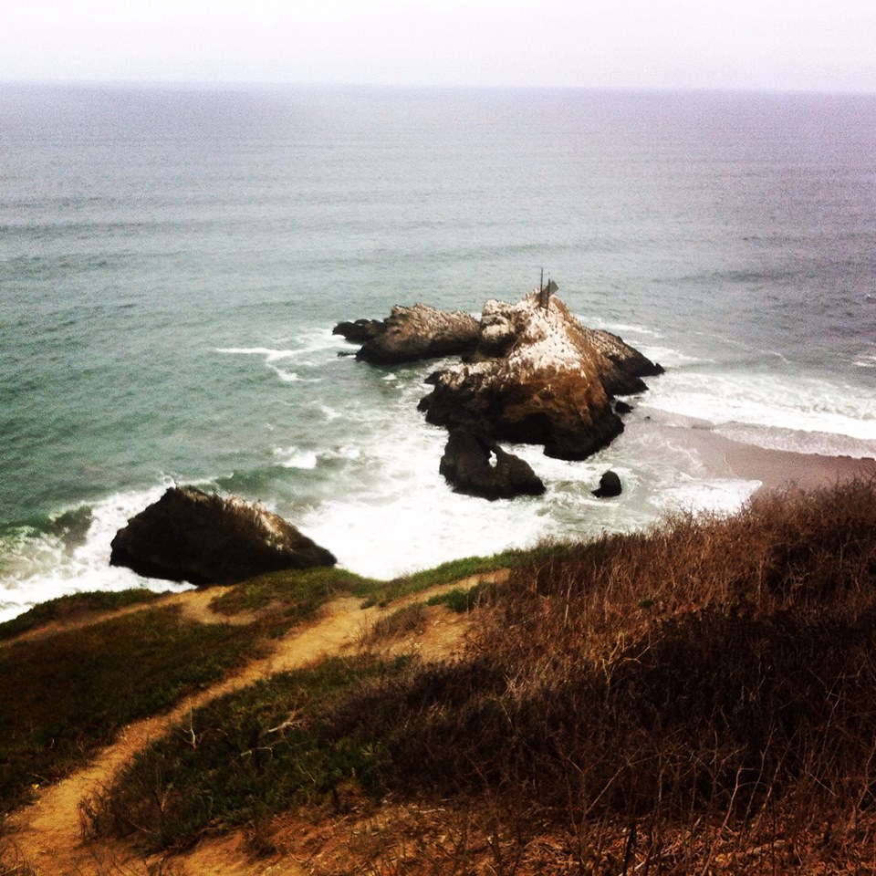 We drove up along the west-facing oceanfront cliffs of the Presidio where groves of redwoods shelter World War II artillery batteries. Ghosts of men in uniform seem to emerge from hovering redwood thickets. The urgent need to guard against invasion left its acrid residue in the air, in the massive concrete bunkers, along the pathways carved through the rugged terrain. What threats, real or imagined, kept these men awake at night, shivering in the cold coastal wind?