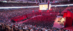 As I sat in the massive sports arena, outfitted in its overhead screens meant for close-ups to penalty shots, I thought of the other times I’ve joined such crowds for ceremonies deemed important in our society. People of all kinds rubbed shoulders in the steep rows of seats, all of us suffering the interminable wait for things to happen. A brass quintet played, their image projected onscreen so that we could see the puffing of the tuba player’s cheeks, the hand stuffed in the bell of the French horn. August cadences of heraldic composition by Bach and other Baroque composers echoed off the high dome of steel and glass. Attendants rushed from place to place.