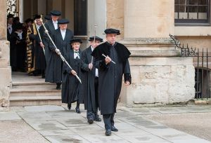 Finally the processional began, resonate strains of that long familiar “Pomp and Circumstance” March No. 1 in D by Sir Edward Elgar (1901). Led by deans and faculty and pages carrying medieval banners announcing the insignia and names of colleges that would be conferring degrees, leadership of the university headed the long lines of graduating students, their robes descended from Middle Age dress just as many buildings on campus continue an ancient architectural tradition.