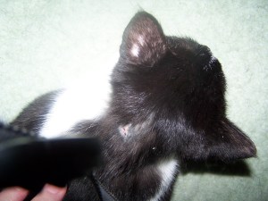 Let me just say that bathing a cat is never easy, but when you’re supposed to keep the shampoo on the cat for ten minutes before rinsing, it’s pretty much impossible. First, a wet, shampoo-slicked cat becomes a self-propelled torpedo in the hands. The only option was to hold her by the scruff of the neck, but this was precisely where the fungus had taken hold. She flew out of my hands more than once and after five minutes and a complete drenching with anti-fungal shampoo, I deemed it good enough.