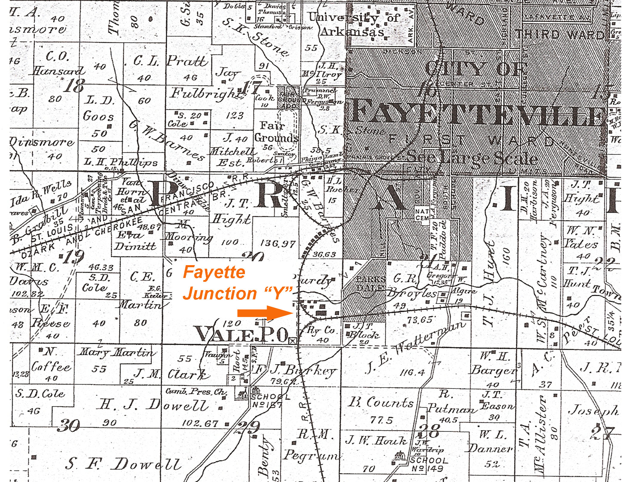Circa 1890 map of Fayetteville Arkansas and the railroad ‘wye’ at Fayette Junction.