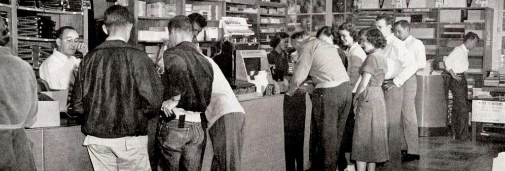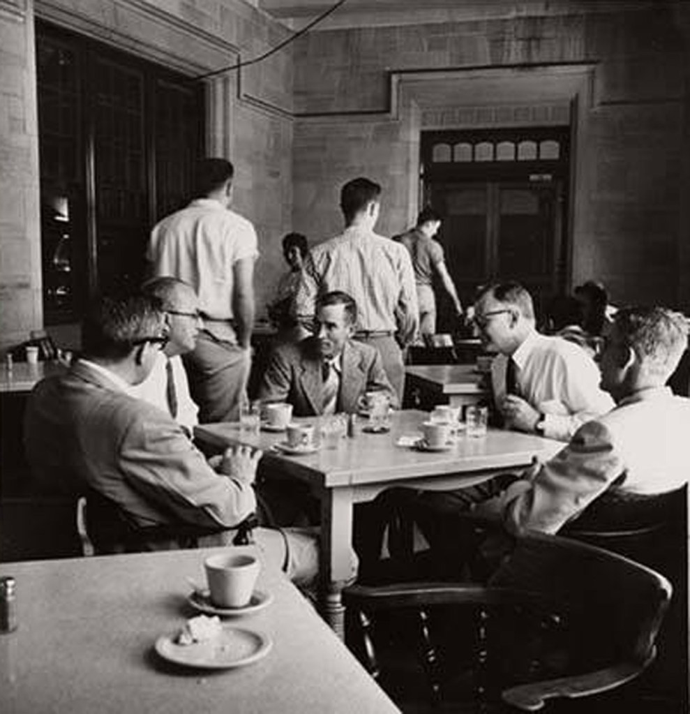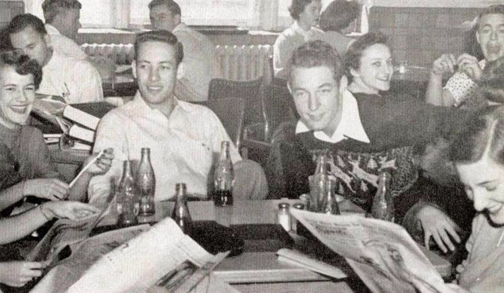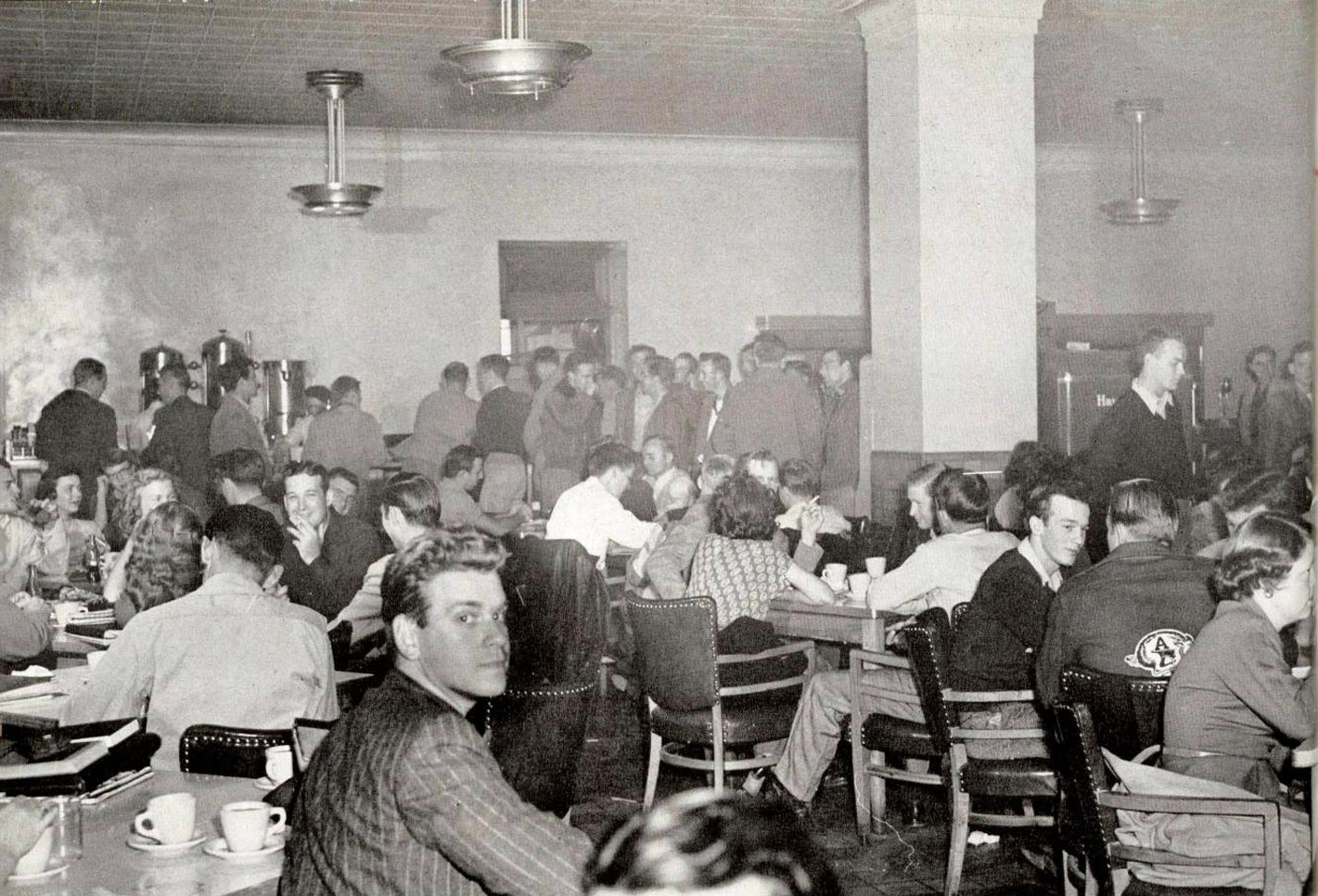 “The fountain room of the Student Union, where at some time or other, everyone sees everyone, is a happy confusion of coffee lines, bridge games, table-hoppers, and glaring renditions from the juke-box. From 9-11, 2 until 5, it’s the place to see and be seen, grab a late breakfast or a hurried lunch, or just sit and talk.” 1951