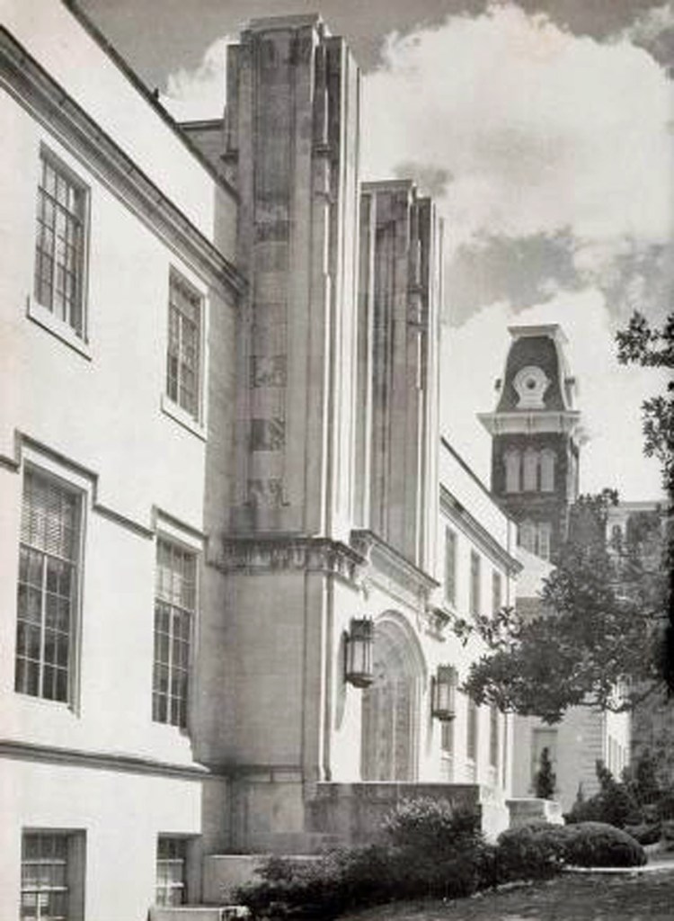 “Equipped with heavy leather chairs and divans, the pastel-colored lounge room can compare very well with the lobby of an expensive hotel. Scattered throughout the room are lamps with indirect lighting, and down at the end is a large fireplace topped by a huge square mirror. Here students come to read, talk, or just listen to the radio.” 1941