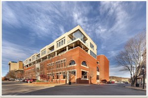 Left foreground: Walton Arts Center. Left background: The Dickson with its eight stories.