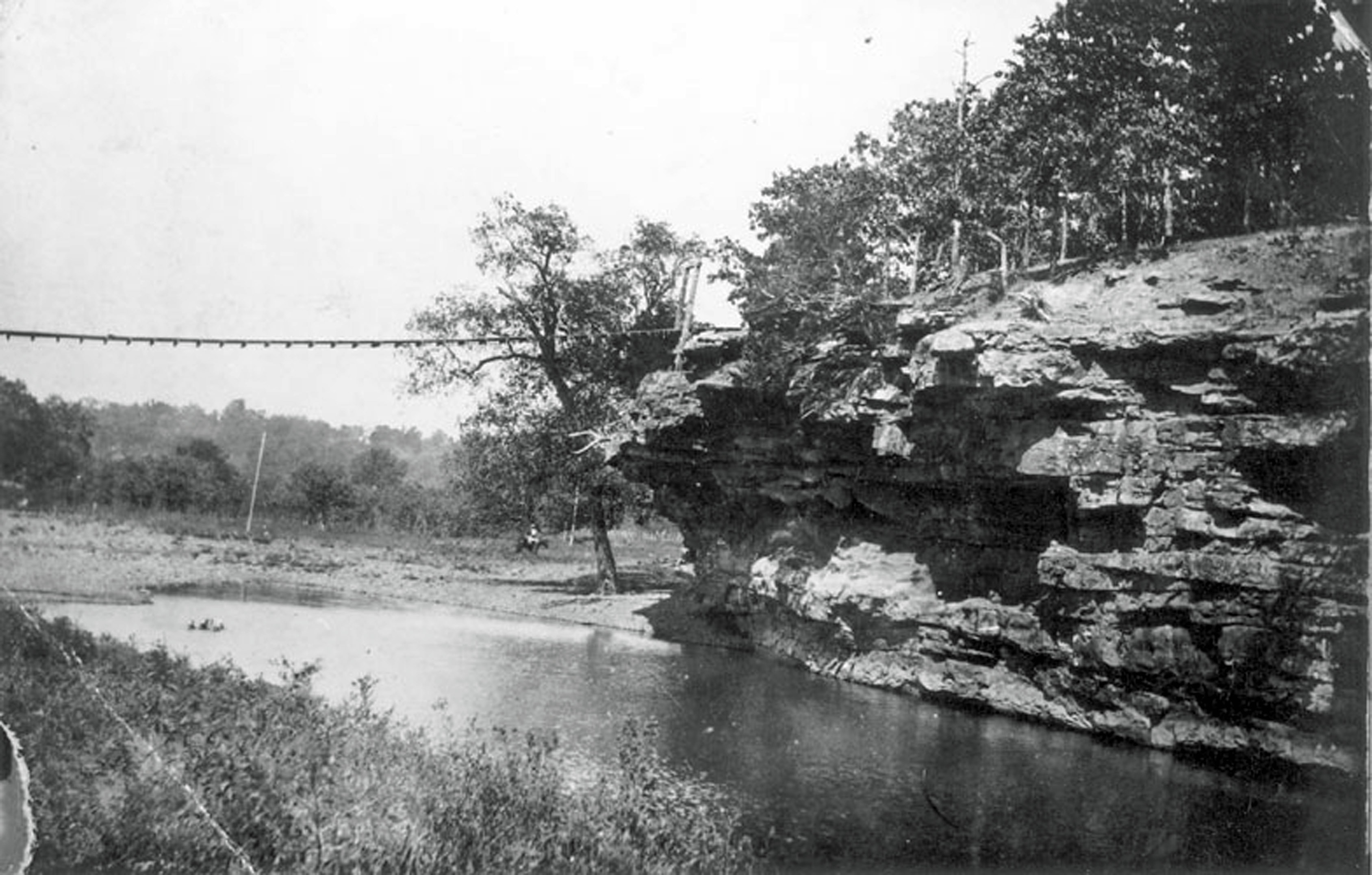 Crossing the river meant riding horseback or wading through the water, but for the hardier sort, there was the swinging bridge. No handrail, folks. This is the site of the modern day two-lane bridge between Highway 71 and ‘downtown’ West Fork.