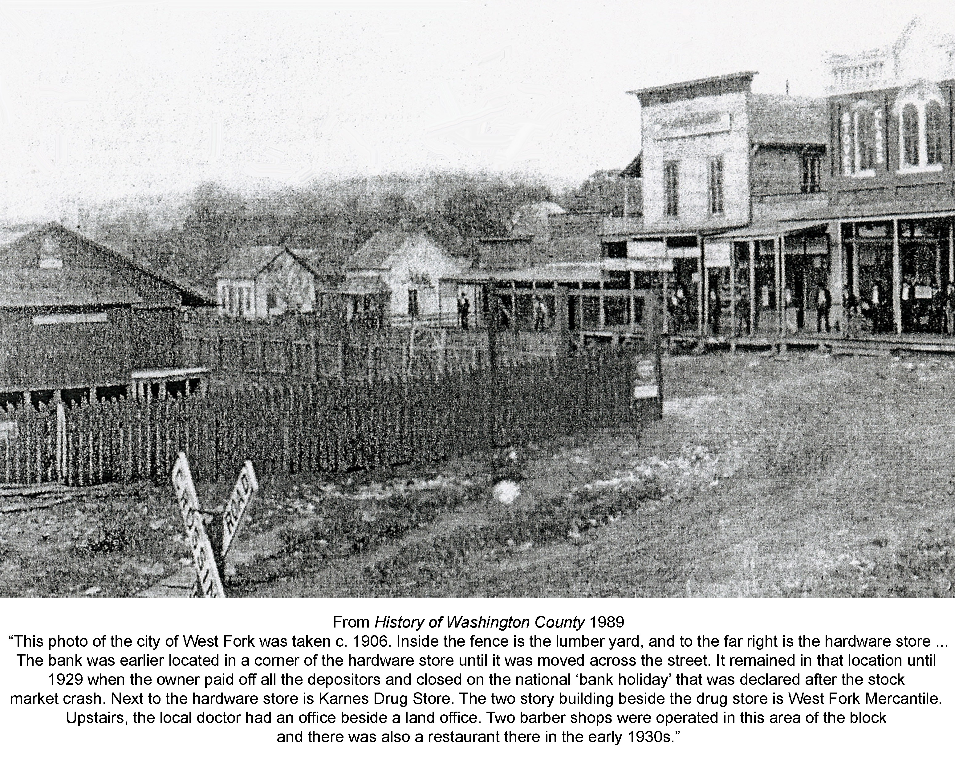 West Fork prospered fairly well until 1919 when an entire block of downtown burned to the ground. The bank lasted until 1929 and closed with the stock market crash. As roads improved and more people made use of motor vehicles, travel became much easier and people began commuting to Fayetteville for jobs, taking even more money away from local businesses. It’s the story of thousands of small rural communities in our country.