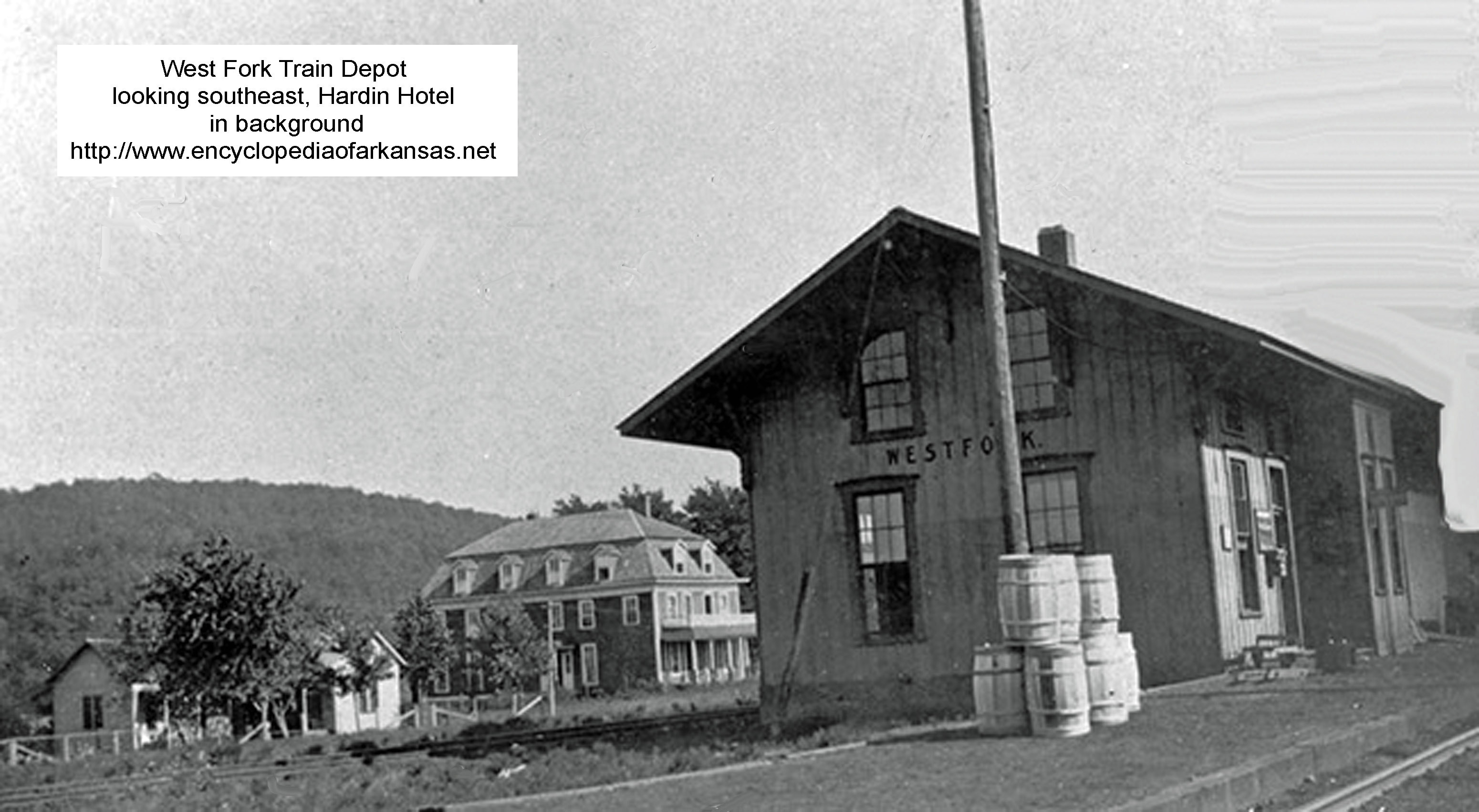 Looking southeast. The Hardin Hotel was built upon the arrival of the railroad at West Fork. The three-story structure included a large dining room where lodgers were fed family style on a huge round table. William Dunbar, who lived at the hotel as a child in the 1920s and 30s remembers an enormous cookstove in the adjacent kitchen. There was a carriage house and the carriage was dispatched to the train depot with each arrival, bringing visitors to the hotel. Robert Winn, in his book “Railroads of Northwest Arkansas,” said that “When drummers arrived at the West Fork station, they registered for lodging–50¢ to $1 per night, meals 25¢ …” There was no indoor plumbing, but according to Dunbar, the outhouse was somewhat luxurious with nice gabled roof, finished interior, and three ‘holes’ for mixed gender usage. But no heat. “You could freeze your bottom off in winter.” Dunbar stated the hotel was taken down in the 30s and the lumber used to build the house currently located on that corner (southeast corner of Main and Maple). The aged oak beams were so hard that when they were repurposed for the house, the carpenters had to use blocks of paraffin to ease the nails through the wood. The existing sidewalk along the property’s north side may date to hotel days.