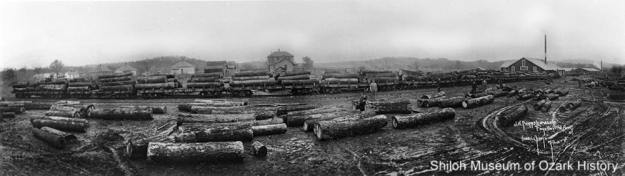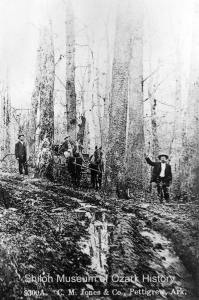 In 1882, the St. Louis-San Francisco Railroad punched through this area headed south. A flood of newcomers followed, eager to make money off the harvest of virgin forest. This hard work involved teams of mules, men on either end of big crosscut saws, and plenty of hacking by ax to clear limbs off the main trunk. Then there was the matter of getting the logs down to the train depot. Many of those logging roads became the roads we drive today.